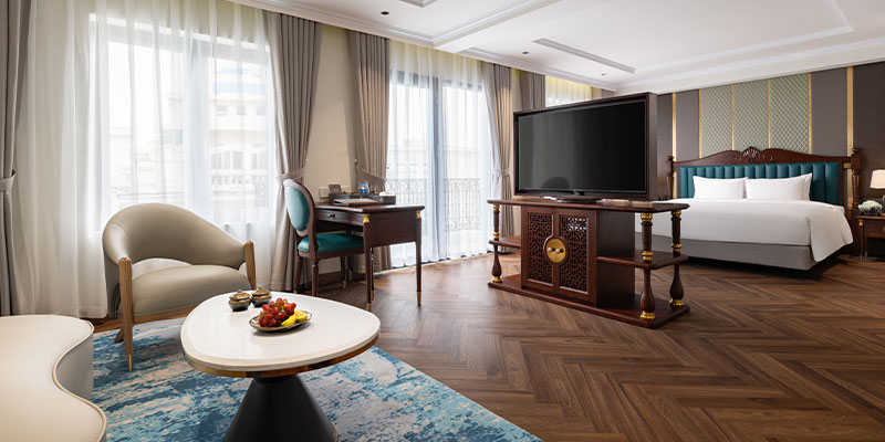 Với diện tích rộng 60m², phòng Signature Suite mang đến không gian sống lý tưởng dành cho những ai tìm kiếm sự thoải mái, riêng tư và sang trọng tuyệt đối. Phòng được thiết kế theo phong cách Á Đông pha lẫn nét cổ điển châu Âu, sử dụng tông màu trầm ấm chủ đạo tạo cảm giác thư giãn, thanh tĩnh nhưng vẫn toát lên vẻ quý phái và tinh tế.