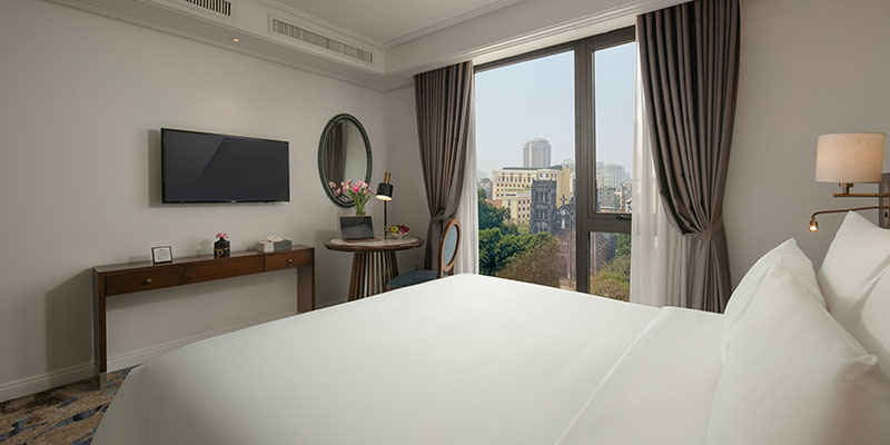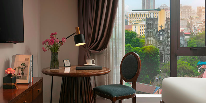 Điểm nhấn đắt giá nhất chính là tầm nhìn trực diện Nhà thờ Lớn Hà Nội. Qua khung cửa kính lớn hoặc ban công riêng, bạn sẽ thấy một Hà Nội rất khác: uy nghi mà bình yên, cổ kính mà đầy chất thơ. Buổi sáng nhâm nhi một tách cà phê, buổi chiều lặng ngắm dòng người, buổi tối nhìn Nhà thờ sáng rực giữa phố cổ – từng khoảnh khắc đều là một trải nghiệm đáng nhớ.