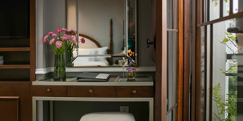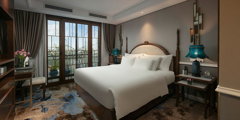 Tâm điểm của căn suite chính là khung cửa sổ rộng mở ra mặt hồ thơ mộng. Từ đây, bạn có thể thấy rõ tháp Rùa cổ kính đứng giữa hồ, cầu Thê Húc đỏ rực vắt cong mềm mại, những hàng cây phản chiếu lên mặt nước – mọi thứ đẹp như một thước phim chậm đầy tính nghệ thuật. Chẳng cần phải xuống phố, bạn vẫn có thể “sống trong hơi thở Hà Nội”, cảm nhận sự bình yên và sâu lắng mà chỉ Hồ Gươm mới mang lại.