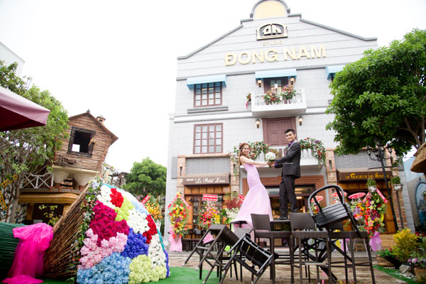 Phim trường Đông Nam (Cần Giuộc, Long An) được xem là điểm đến lý tưởng của các cặp đôi, ví như thế giới cổ tích Châu Âu tại Việt Nam. Từ đỉnh tháp nhô cao đến bức tường đá rêu phong, thùng rượu gỗ hay các vật phẩm xưa đã tạo thêm nguồn cảm hứng cho cô dâu - chú rể và ê kíp studio.