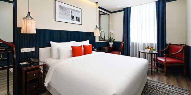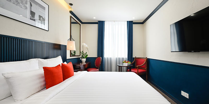 Chiếc giường đôi lớn được bố trí tinh tế cùng chất liệu cao cấp, giúp bạn tận hưởng giấc ngủ êm ái sau một ngày dài khám phá. Nội thất trong phòng là sự hòa quyện giữa đường nét cổ điển tinh xảo và phong cách hiện đại tối giản, tạo nên cảm giác vừa ấm cúng, vừa thời thượng.