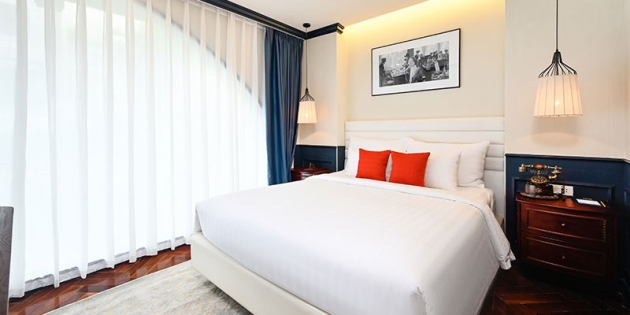 Chiếc giường đôi lớn phủ drap trắng muốt, kết hợp cùng sắc nâu trầm ấm của gỗ tự nhiên, tạo nên tổng thể vừa sang trọng vừa gần gũi. Từ khung cửa sổ hướng ra thành phố hoa lệ, bạn có thể phóng tầm mắt ngắm nhìn Sài Gòn rực rỡ khi đêm xuống – ánh đèn lấp lánh hòa cùng nhịp sống sôi động như một bản nhạc không lời khiến lòng người say đắm.