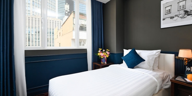Điểm nhấn của căn phòng chính là tầm nhìn toàn cảnh hướng ra thành phố, nơi bạn có thể thả hồn ngắm nhìn dòng người tấp nập bên dưới, ánh đèn rực rỡ phản chiếu trên những con phố – như một bức tranh sống động về Sài Gòn không bao giờ ngủ.
