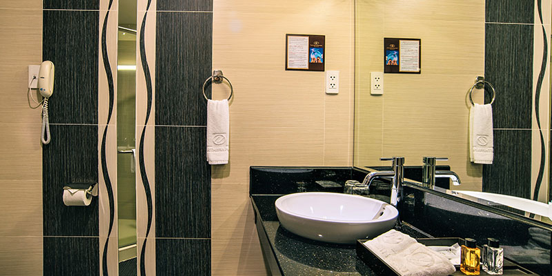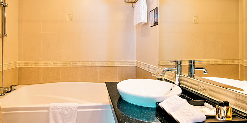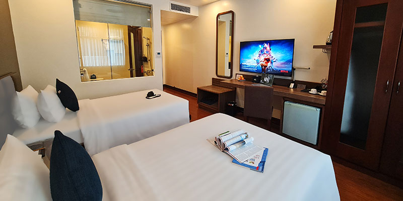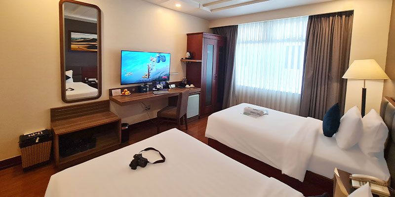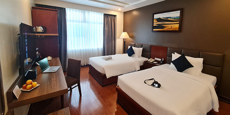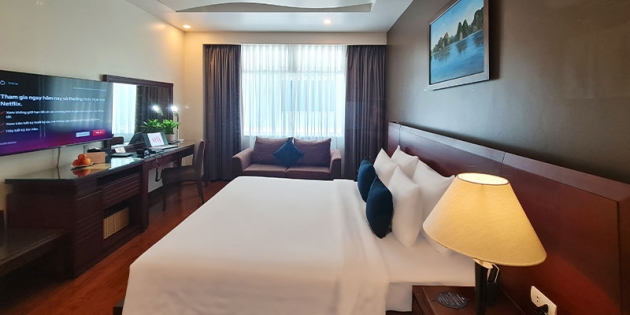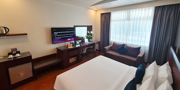 Ánh sáng tự nhiên chan hòa qua khung cửa sổ rộng, mở ra khung cảnh thành phố sống động. Nội thất sang trọng với gam màu trầm ấm, các chi tiết décor tinh xảo cùng đầy đủ trang thiết bị hiện đại – từ TV thông minh, minibar, két sắt cá nhân, đến phòng tắm tiện nghi – tất cả tạo nên một không gian riêng tư, thư thái nhưng vẫn đậm dấu ấn phong cách.