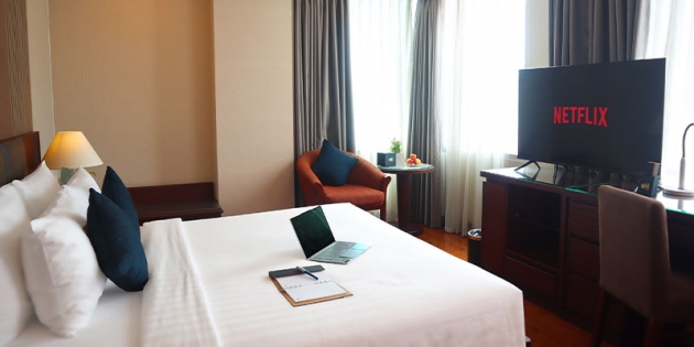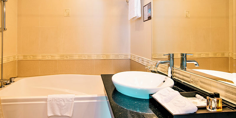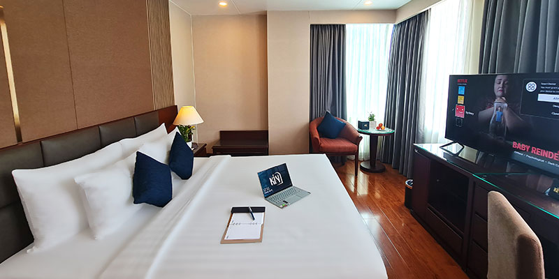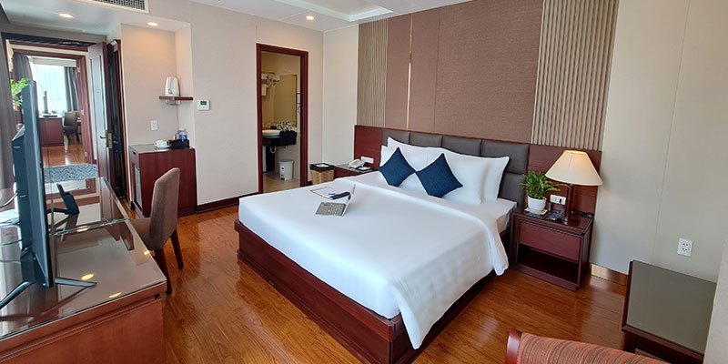 Không chỉ gây ấn tượng bởi thiết kế tinh giản mà sang trọng, căn phòng còn được trang bị đầy đủ tiện nghi hiện đại: TV màn hình phẳng, minibar, két sắt, bàn làm việc, điều hòa và phòng tắm riêng với nội thất cao cấp. Mọi chi tiết – từ ánh sáng, màu sắc cho đến chất liệu – đều được sắp đặt tỉ mỉ, tạo nên không gian vừa ấm áp, vừa thời thượng, phù hợp cho cả khách du lịch và công tác.