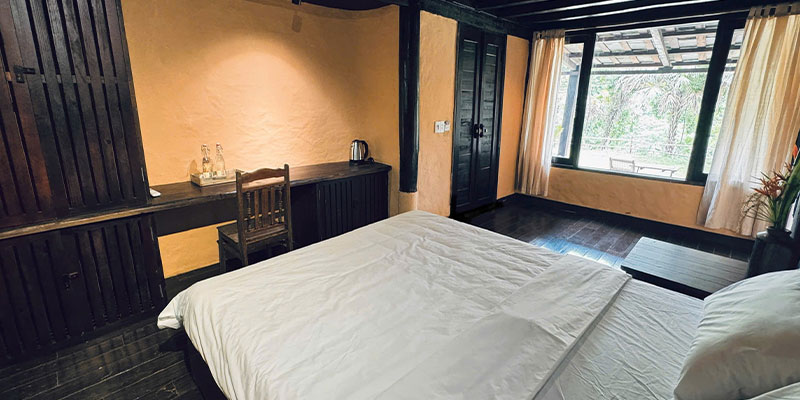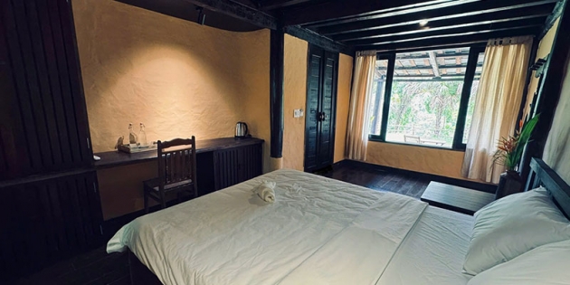Không gian phòng được xây dựng chủ yếu bằng gỗ tự nhiên – vừa mang lại cảm giác ấm cúng, vừa giữ trọn hơi thở mộc mạc đặc trưng của vùng sơn cước. Thiết kế mở, kết hợp cùng ánh sáng tự nhiên len lỏi qua những khung cửa lớn, giúp phòng luôn tràn ngập sinh khí và năng lượng tươi mới.