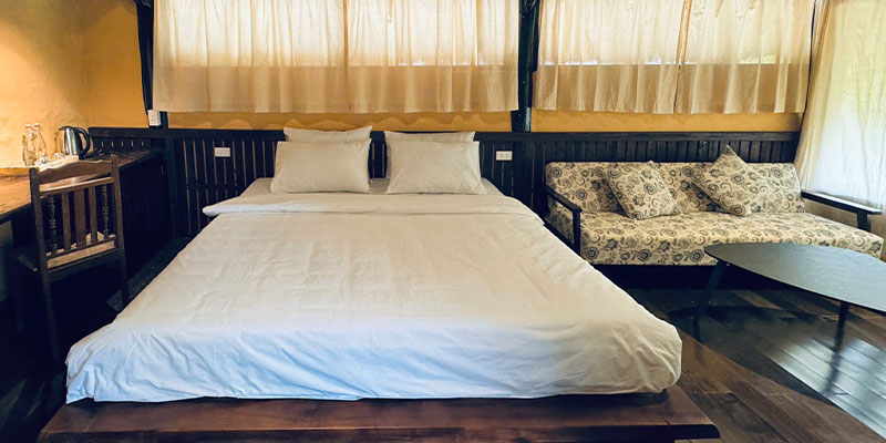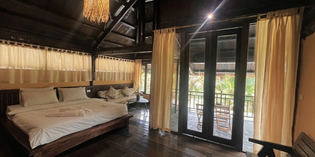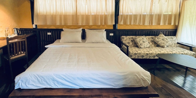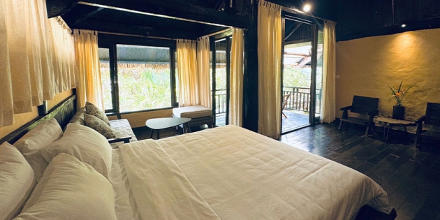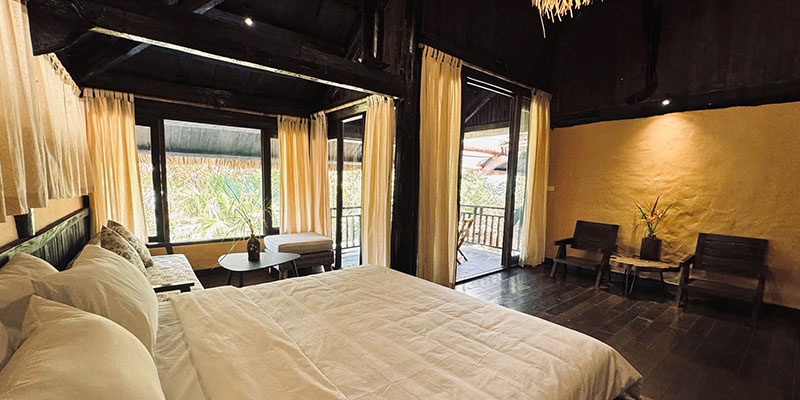 Căn phòng được xây dựng chủ yếu từ gỗ tự nhiên, mang lại cảm giác ấm cúng và thân thiện. Thiết kế mang hơi thở truyền thống của nhà sàn vùng cao, kết hợp hài hòa với trang thiết bị hiện đại – từ giường êm ái, chăn ga gối sạch sẽ, điều hòa, tủ lạnh mini đến phòng tắm riêng tiện nghi. Từng chi tiết đều được chăm chút tỉ mỉ, đem đến cho bạn trải nghiệm nghỉ dưỡng thoải mái, riêng tư và trọn vẹn nhất.
