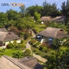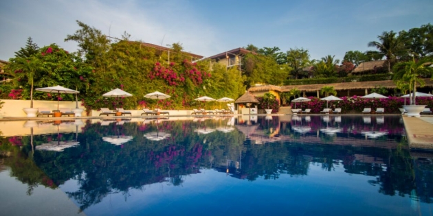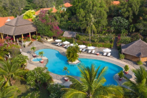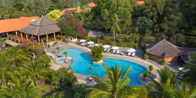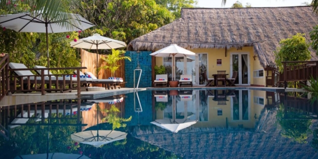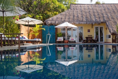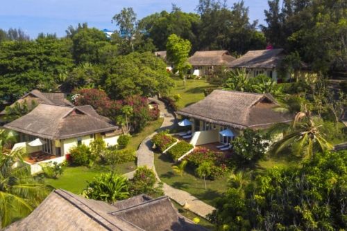 Khu nghỉ dưỡng sở hữu các biệt thự và bungalow lợp mái phong cách đồng quê Việt Nam, mộc mạc nhưng đầy đủ tiện ích. Sự giao hòa giữa nét truyền thống và phong cách Đông Dương hiện đại mang đến cảm giác gần gũi, mới lạ và ấm cúng.