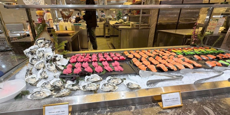 Tại Lantine, thực khách được dẫn dắt qua ba nền ẩm thực Việt - Á - Âu với những món ăn vừa quen thuộc vừa đầy mới mẻ: sashimi cá hồi Na Uy mát lạnh, gan ngỗng áp chảo kiểu Âu mềm mượt vị béo, bánh cuốn tôm kiểu Việt dẻo mịn chuẩn vị. Không gian buffet tràn ngập sắc hương từ salad Madame d’Orient, pasta kem béo, tôm rim đường hoa mai... khép lại bằng quầy tráng miệng tinh tế với bánh Pháp, chè Việt, kem lạnh và trái cây tươi.