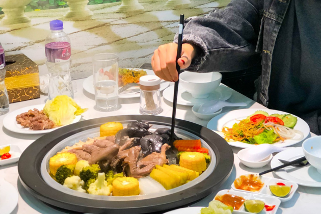 Chi tiết set ăn gồm: Cá tầm hấp tiêu, mực, đùi gà da giòn, ba chỉ bò cuộn nấm, dải heo ướp mắm, ngao trắng, rau củ quả tổng hợp, miến hấp ba chỉ bò bắp cải, cháo gạo nếp đậu xanh bí đỏ sườn sụn (Số lượng đồ ăn theo số lượng người sử dụng).