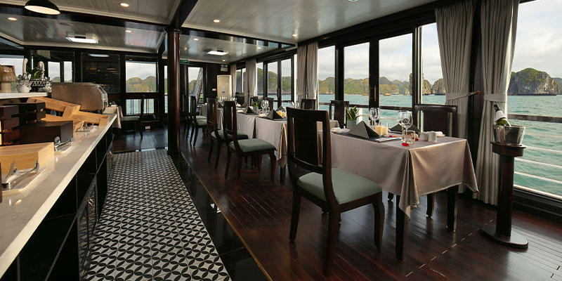 - nhà hàng của du thuyền. Quý khách lưu ý về trang phục lịch sự khi tham gia tiệc tối. Sau bữa tối, Quý khách tham gia các trò chơi tại khu vực giải trí ngoài trời trên sundeck và hoạt động câu mực trên tender.
