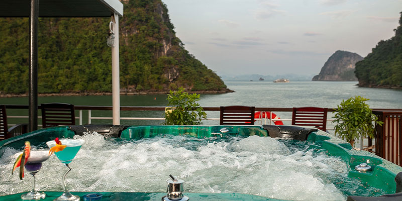 Lily Cruise nổi bật với jacuzzi ngoài trời, hồ bơi thư giãn, không gian spa massage, quầy bar boong tàu và nhà hàng chuẩn 4 sao phục vụ ẩm thực đa dạng - từ đặc sản Việt đến thực phẩm Halal có chứng nhận. Các hoạt động như tiệc trà khi hoàng hôn buông xuống, lớp học gói nem tươi, hay phút giây câu mực đêm sẽ là điểm nhấn khó quên trong hành trình khám phá vịnh biển.