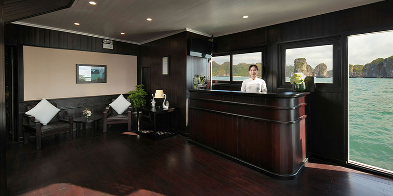- 11h45: Có mặt tại nhà chờ Nhân viên du thuyền phục vụ Quý khách đồ uống chào mừng và hỗ trợ làm thủ tục check in tại nhà chờ C55 Cảng số 2, Cảng Tàu khách quốc tế Tuần Châu.