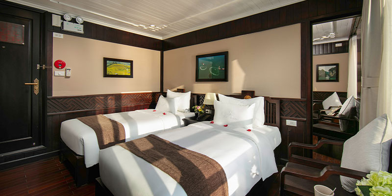 Hạng phòng Deluxe Ocean View Cabin có diện tích 20m², mang đến không gian thoải mái cho 2 người lớn và 1 trẻ em dưới 5 tuổi. Vị trí tầng 1 với góc nhìn hướng đại dương, giúp du khách thưởng thức cảnh quan từ chính cabin riêng tư của mình. Thiết kế ấm cúng, chan hòa ánh sáng tự nhiên là điểm cộng lớn cho kỳ nghỉ thêm phần trọn vẹn.