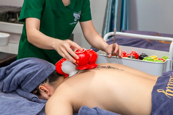 Đặc biệt, liệu pháp còn thực hiện giác hơi, đào thải độc tố bằng bộ giác sứ ngọc trai. Bộ giác hơi được làm từ đất ngọc trai với nhiều loại thảo dược thiên nhiên, giúp đào thải độc tố, lưu thông khí huyết và hỗ trợ cải thiện sức khỏe.