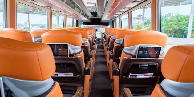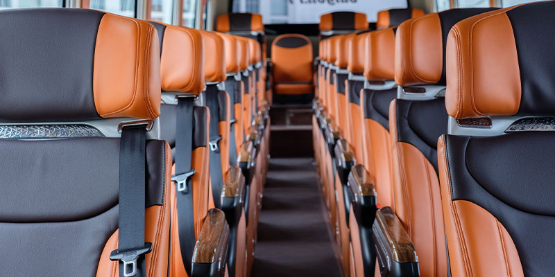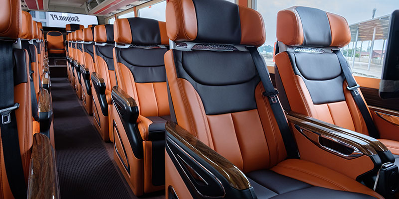 Bước lên xe Mexbus, bạn như bước vào khoang hạng nhất giữa mặt đất. Xe Limousine 27 chỗ được thiết kế tinh tế với ghế bọc da nghiêng 45 độ, chỗ để chân rộng rãi và đệm êm ái giúp bạn thư giãn suốt hành trình.