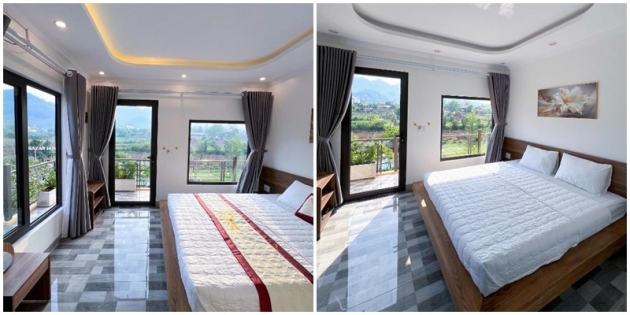 Mỗi căn phòng đều được trang bị đầy đủ tiện nghi hiện đại – tivi, điều hòa, tủ lạnh mini, phòng tắm riêng cùng các vật dụng cá nhân cần thiết – đáp ứng hoàn hảo nhu cầu nghỉ dưỡng của cả gia đình hoặc nhóm bạn. Từ khung cửa sổ, du khách có thể ngắm nhìn bức tranh thiên nhiên Mộc Châu xanh mướt, nơi sương sớm vờn qua những triền đồi và nắng vàng len lỏi qua từng tán lá.