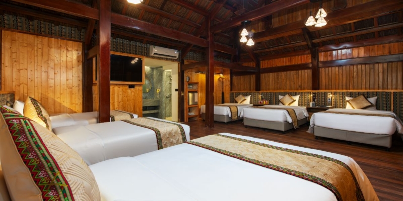 Thai Village - điểm nhấn trong Sản phẩm 2N1Đ - tái hiện nét đẹp nhà sàn dân tộc Thái, sử dụng vật liệu tự nhiên như gỗ, tre, mái lá. Không gian mở, cửa sổ lớn đưa du khách hòa mình vào màu xanh của núi rừng và hơi thở bình yên đặc trưng Tây Bắc.