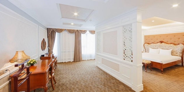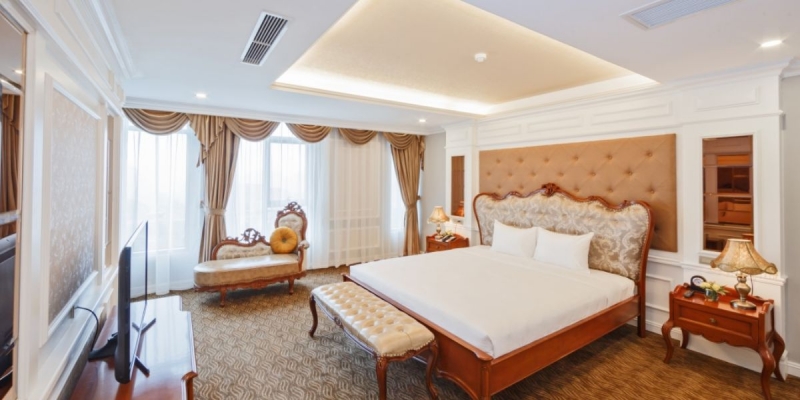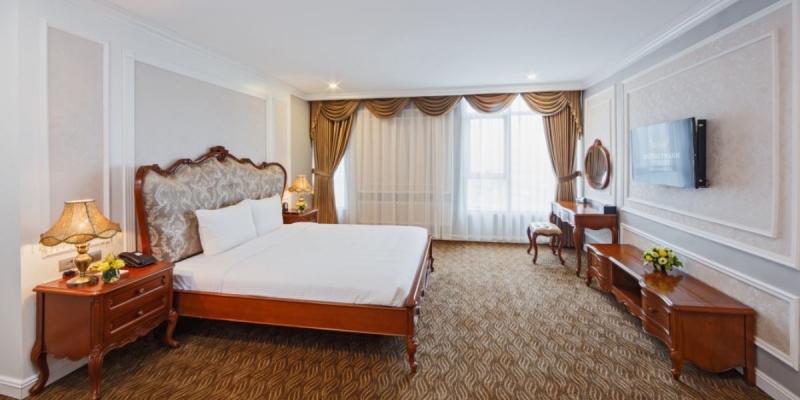 Giữa 171 phòng nghỉ đạt chuẩn 4 sao của khách sạn, Presidential Suite chính là “trái tim” của sự tinh tế và xa hoa. Với diện tích 350m², căn phòng được bố trí phòng khách lớn, hai phòng ngủ riêng biệt cùng bồn tắm Jacuzzi hiện đại tạo nên không gian lý tưởng cho gia đình, cặp đôi hoặc doanh nhân muốn tận hưởng cảm giác khác biệt.