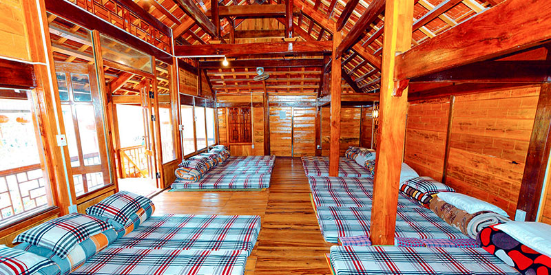 Với diện tích 25m², nhà sàn nhỏ được thiết kế theo phong cách truyền thống vùng cao, mái lá, sàn gỗ, chăn đệm trải liền, mang đến cảm giác ấm cúng và thân thuộc. Dù không có rèm che giữa các đệm hay phòng vệ sinh khép kín, chính điều đó lại khiến du khách cảm nhận rõ nét hơn sự gần gũi, gắn kết giữa người với người – như cách đồng bào nơi đây sống chan hòa, sẻ chia từng câu chuyện, nụ cười bên nhau.