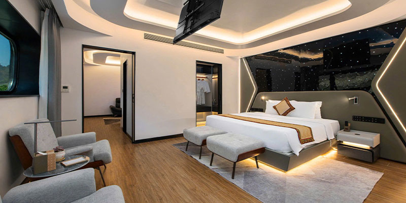 Phòng Pullman VIP nằm ở toa đầu tiên của đoàn tàu, được thiết kế để mang đến không gian nghỉ dưỡng sang trọng, tinh tế và tràn ngập tiện nghi. Đây là lựa chọn hoàn hảo cho những du khách muốn tận hưởng sự riêng tư tuyệt đối, vừa nghỉ ngơi vừa ngắm nhìn toàn cảnh thung lũng xanh mướt hay Cầu kính Bạch Long hùng vĩ từ phòng.