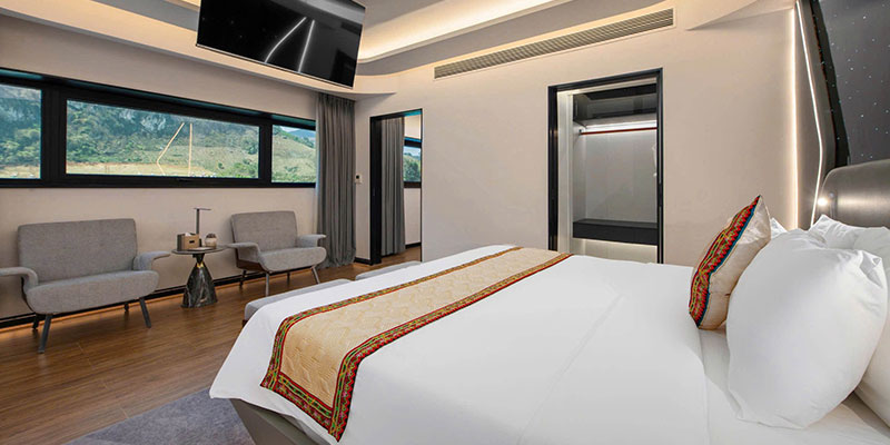 Với giường King dành cho 2 người, phòng Pullman VIP kết hợp hài hòa giữa sự thoải mái và sang trọng, mang đến giấc ngủ sâu và khoảnh khắc thư giãn trọn vẹn sau một ngày trải nghiệm thiên nhiên Mộc Châu.