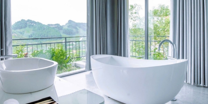 Điểm nhấn không thể bỏ qua chính là bồn tắm hướng ban công, nơi bạn chỉ cần kéo nhẹ rèm là thiên nhiên ùa vào. Ngâm mình trong làn nước ấm, nhâm nhi tách trà, ngắm mây trôi - một “liệu pháp” hồi sinh năng lượng đúng nghĩa.