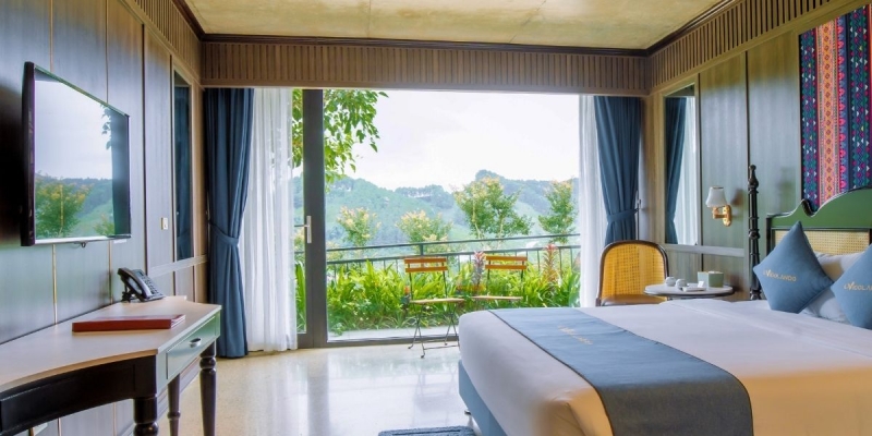 Với diện tích 35m², phòng Standard Terrace with Balcony được thiết kế tinh tế theo phong cách hiện đại tối giản, nổi bật với ban công riêng hướng ra khung cảnh núi non hùng vĩ và bản làng yên ả phía xa.