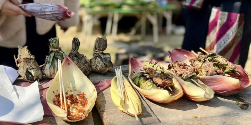 Ẩm thực nơi đây là sự giao hòa giữa tinh hoa Tây Bắc và phong cách chế biến tinh tế từ cá suối nướng, thịt trâu gác bếp đến rau rừng chấm chẳm chéo, tất cả đều mang đậm dấu ấn núi rừng.