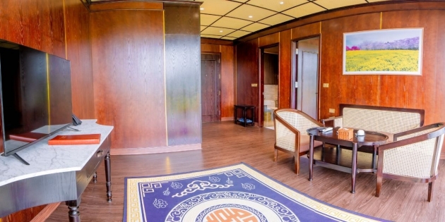 Wooden Bungalow Suite được thiết kế theo phong cách cổ điển - tối giản, kết hợp khéo léo giữa chất liệu gỗ nâu trầm ấm và tông xanh thiên nhiên. Với diện tích 60m², căn phòng gồm một phòng ngủ và một phòng khách, phù hợp cho hai người lớn và một trẻ nhỏ. Không gian này đủ riêng tư để bạn tận hưởng sự tĩnh lặng, nhưng cũng đủ ấm cúng để cảm nhận sự gắn kết.