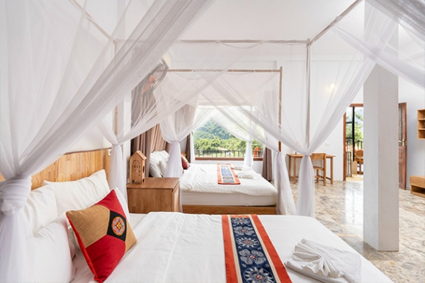 Phòng Superior Tripple có diện tích 50 m2, được thiết kế tinh tế, ấm áp với nội thất chủ đạo từ gỗ cùng ban công rộng thoáng hướng nhìn ra thung lũng và ruộng bậc thang rộng mở mang cảm giác gần gũi, thân quen tới du khách.