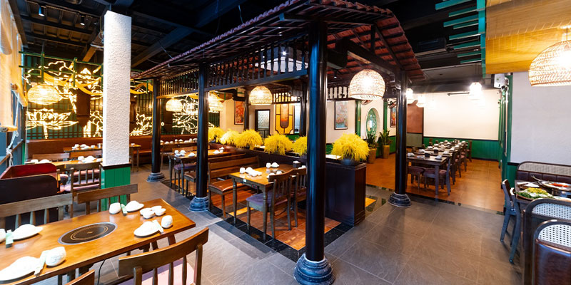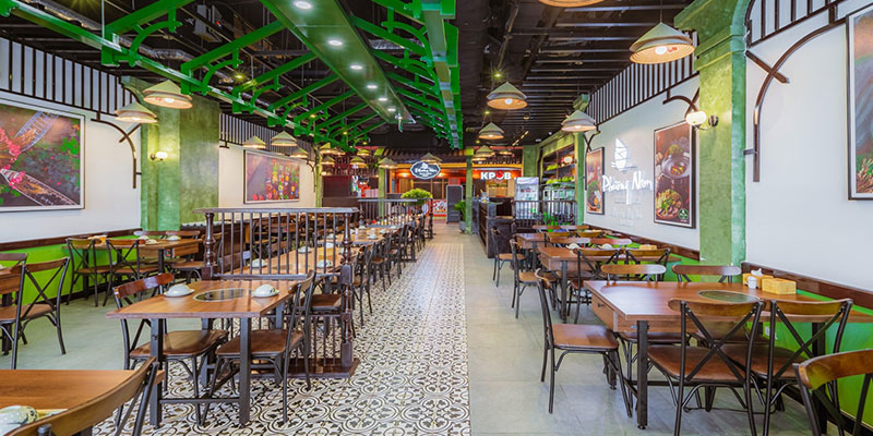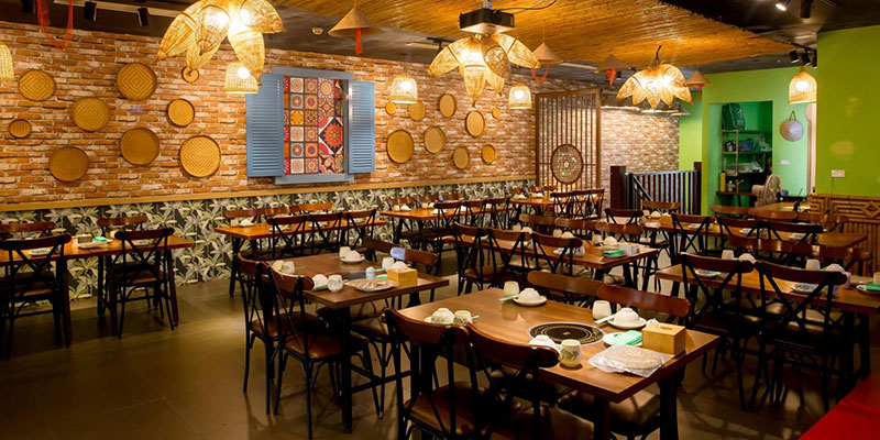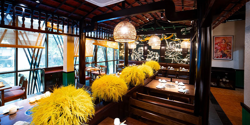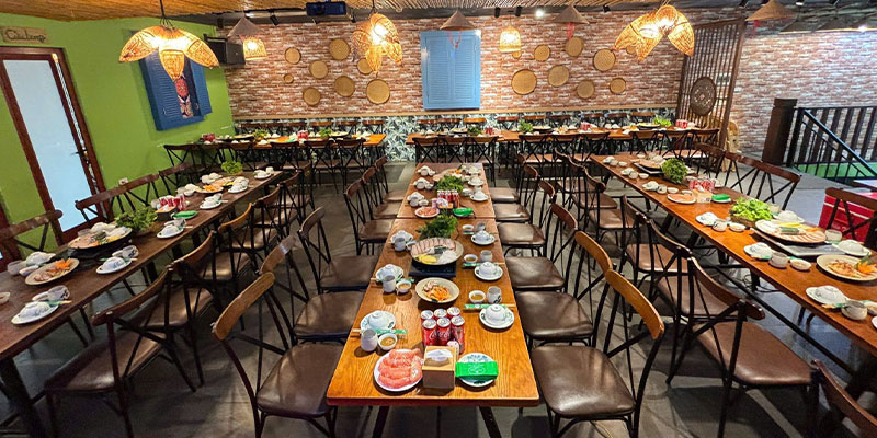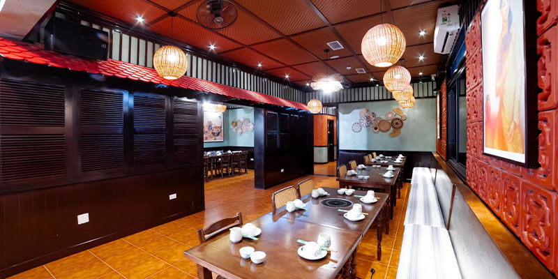 Không chỉ níu chân thực khách bằng món ngon, Nhà hàng Phương Nam cơ sở 3 còn chạm đến trái tim bằng không gian mang đậm dấu ấn dân gian xưa cũ. Những chiếc đèn khéo léo nằm gọn trong nan tre, ánh sáng vàng nhẹ tỏa ra, soi rọi lên bộ bàn ghế gỗ mộc mạc – tất cả gợi lên một không khí ấm cúng, gần gũi, như trở về căn nhà nhỏ nơi miền quê thanh bình.