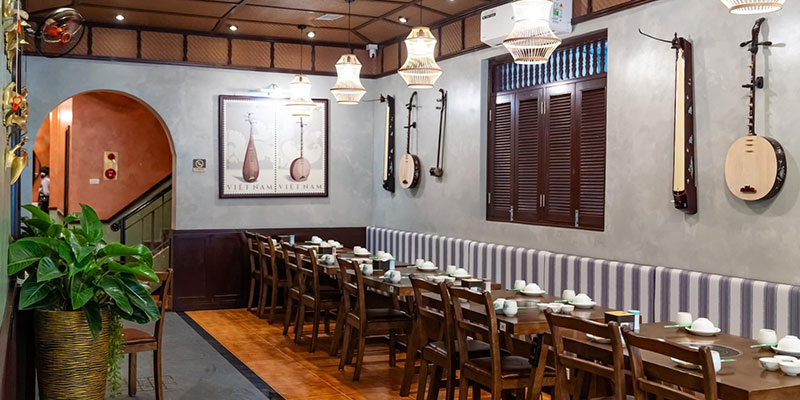 Trên những bức tường nhã nhặn, các nhạc cụ dân tộc như đàn nhị, đàn nguyệt được treo ngay ngắn, như gửi gắm hồn âm nhạc miền sông nước vào từng góc nhỏ. Mỗi chi tiết đều toát lên vẻ đẹp dung dị mà tinh tế – nơi người ta có thể vừa ăn, vừa cảm nhận nhịp sống chậm rãi, an yên của quê hương.