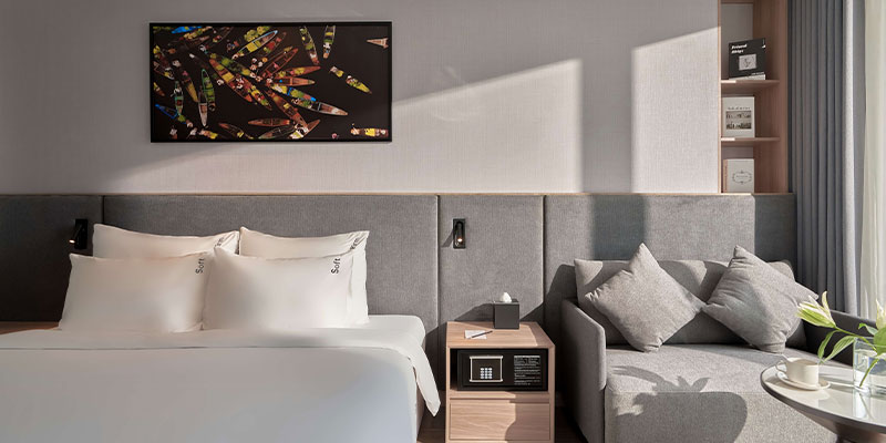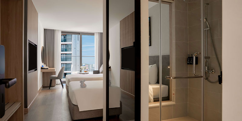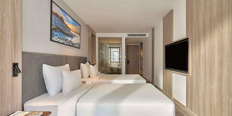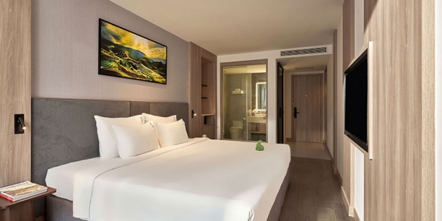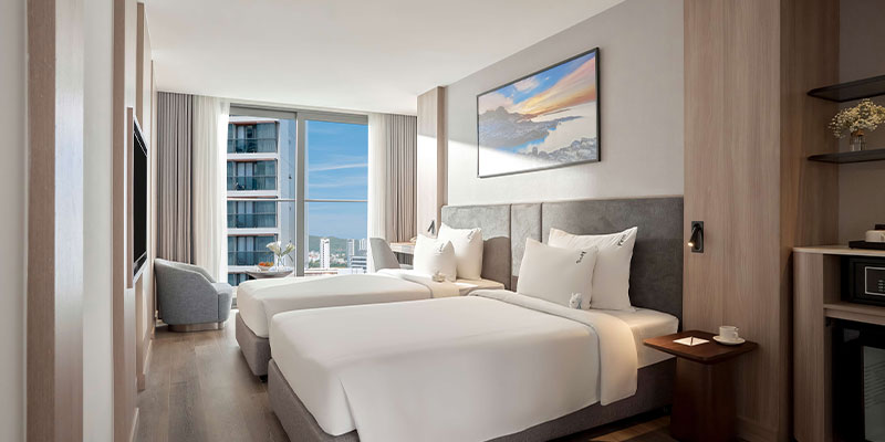 Phòng được trang bị giường King hoặc Twin Bed êm ái, cùng nội thất hiện đại và tông màu ấm áp, tạo cảm giác thư giãn ngay khi đặt chân vào. Mọi chi tiết – từ bộ chăn ga cao cấp, bàn làm việc tiện nghi, tivi màn hình phẳng, minibar, két sắt cá nhân, cho đến phòng tắm kính trong suốt với vòi sen hiện đại – đều được chăm chút tỉ mỉ để mang lại trải nghiệm tiện nghi và tinh tế bậc nhất.