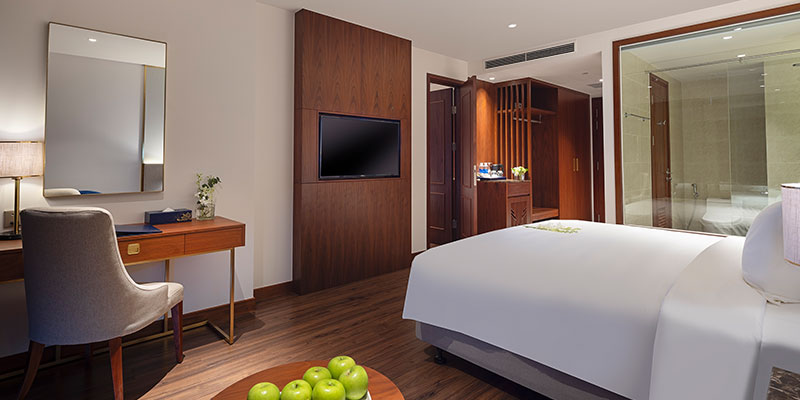 • Trang bị đầy đủ tiện nghi: TV, WiFi, két sắt, minibar, bàn làm việc, áo choàng tắm cao cấp.