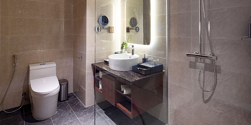 • Phòng tắm với áo choàng tắm, máy sấy tóc, bộ đồ dùng cao cấp tạo nên trải nghiệm như tại spa riêng.