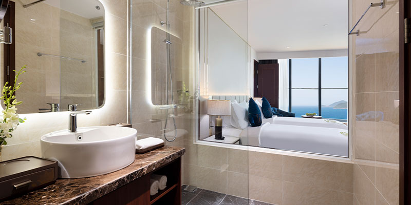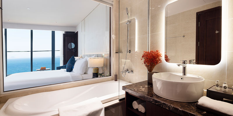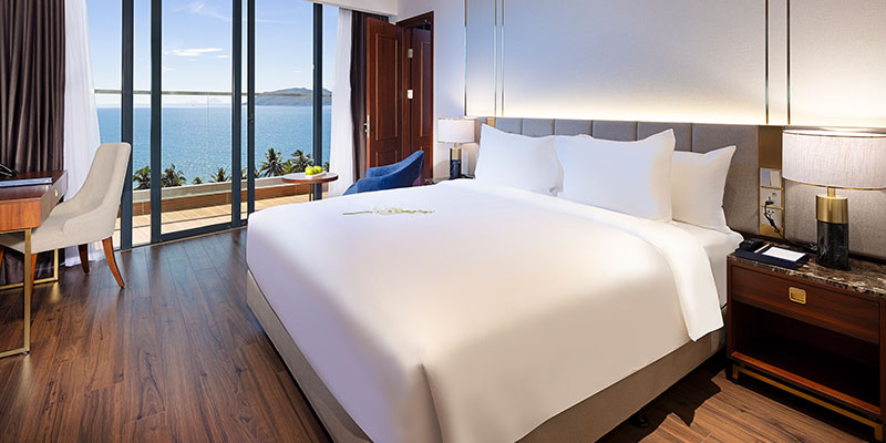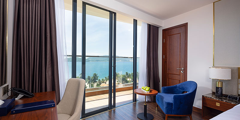 Phòng Premier Ocean View nổi bật với diện tích khoảng 34m², sở hữu ban công riêng và hệ thống cửa kính kịch trần, giúp mở rộng tầm nhìn hướng trọn ra đại dương xanh ngát của Vịnh Nha Trang. Không gian phòng toát lên vẻ nghệ thuật đặc trưng khi được thiết kế theo phong cách Art Deco - kết hợp tinh tế giữa đường nét cổ điển và nội thất hiện đại. Tùy theo nhu cầu, bạn có thể lựa chọn giường đôi lớn hoặc 2 giường đơn.