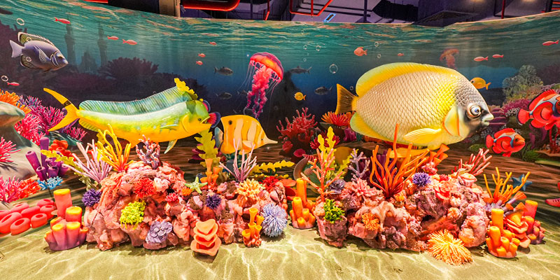 Từng chi tiết tại Magic House đều toát lên vẻ huyền bí và rực rỡ của đại dương: ánh sáng phản chiếu mềm mại như sóng biển, sắc xanh thanh mát, các mô hình san hô, sinh vật biển sống động... mang đến cảm giác vừa thư giãn vừa kích thích trí tưởng tượng cho cả trẻ nhỏ lẫn người lớn.