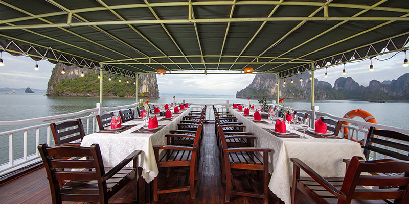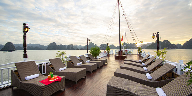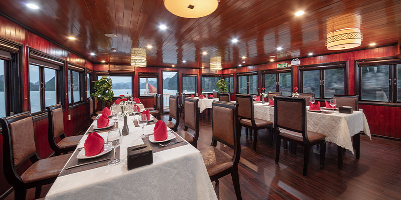 Du khách sẽ được phục vụ các bữa ăn tại nhà hàng sang trọng trên tàu, thưởng thức các món hải sản tươi ngon và ẩm thực địa phương. Trên sundeck thoáng đãng, bạn có thể hòa mình vào tiệc hoàng hôn với trà, cà phê và trái cây. Đây là nơi lý tưởng để ngắm nhìn Vịnh Hạ Long vào lúc chiều tà - khoảnh khắc không thể bỏ lỡ trong chuyến đi.