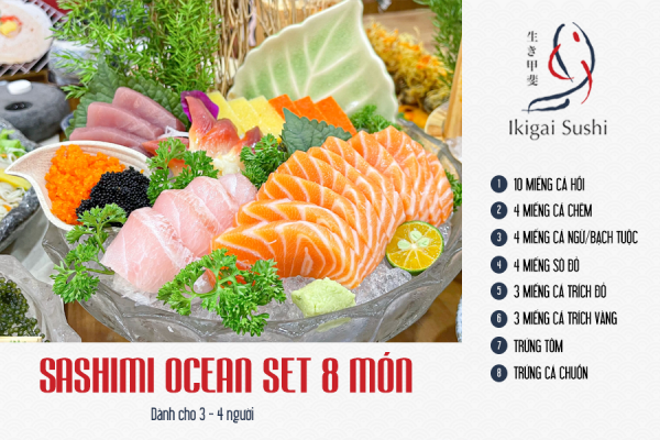 Văn hóa ẩm thực xứ sở "mặt trời mọc luôn có sức hấp dẫn và lan tỏa trên toàn thế giới không chỉ bởi hương vị thơm ngon, cách thức chế biến độc đáo mà còn cung cấp đầy đủ chất, cân đối các chất dinh dưỡng tốt cho sức khỏe. Là một tín đồ ẩm thực Nhật hay muốn đổi gió cho bữa ăn của gia đình thì bạn không thể bỏ qua "Sashimi ocean set 8 món dành cho 3-4 người tại nhà hàng Ikigai Sushi".