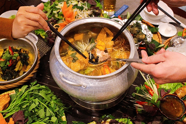 Điểm nổi bật của set ăn này chính là nồi lẩu ốc nóng hổi bốc khó nghi ngút, với vị thơm chua thanh của giấm bỗng, chút ớt cay đầu lưỡi rất đặc trưng. Ăn kèm lẩu ốc thường có đậu phụ, ốc thịt béo ngậy, sườn sụn cùng các loại rau ăn kèm tất cả tạo nên nồi lẩu ốc vô cùng hấp dẫn.