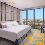Phòng Suite gây ấn tượng mạnh với diện tích lên đến 93m², được chia thành phòng khách riêng biệt và phòng ngủ tách biệt, đảm bảo sự riêng tư tuyệt đối. Cách bố trí thông minh tạo nên không gian sống thoải mái, phù hợp cho cặp đôi, gia đình hoặc khách công tác muốn tận hưởng sự tiện nghi đẳng cấp trong một không gian rộng rãi và thư thái.