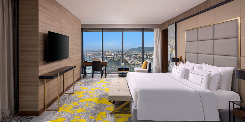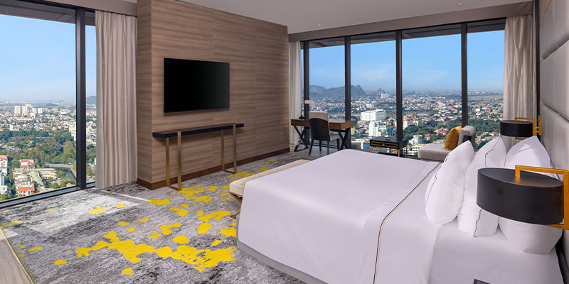 Điểm nhấn không thể bỏ qua của hạng phòng Suite chính là hệ thống tường kính bao quanh, giúp ánh sáng tự nhiên tràn vào khắp căn phòng. Từ đây, du khách có thể ngắm nhìn toàn cảnh thành phố Thanh Hóa – từ ánh bình minh ấm áp buổi sáng đến những dải đèn lung linh khi màn đêm buông xuống. Mỗi khoảnh khắc đều trở thành một bức tranh sống động.