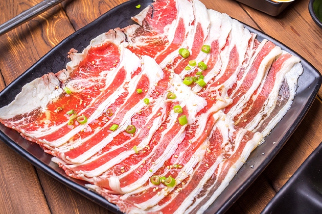 Bên cạnh đó, nguyên liệu chính của nồi lẩu là thịt bò Angus hảo hạng từ phần ba chỉ bò, nạc vai bò, gầu bò, bắp bò, bò viên xay chắc chắn sẽ làm say lòng cả những thực khách khó tính nhất. Đặc điểm chung đó là thớ thịt tốt, có vân mỡ trắng xen kẽ trong những thớ thịt giúp thịt mềm và có vị béo dễ chịu, thịt màu đỏ tươi sáng. Bò Angus thơm ngon không chỉ nhờ chế độ dinh dưỡng mà còn do điều kiện khí hậu, môi trường chăn nuôi và phương pháp chăn nuôi hiện đại.