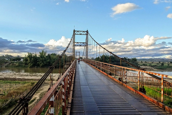 Chiếc cầu in bóng uy nghi dưới dòng nước sông Đắk Bla phẳng lặng. Bao quanh chiếc cầu là những ngọn núi cao hùng vĩ được bao phủ bởi những nương dâu xanh rì của người dân Kon Tum.