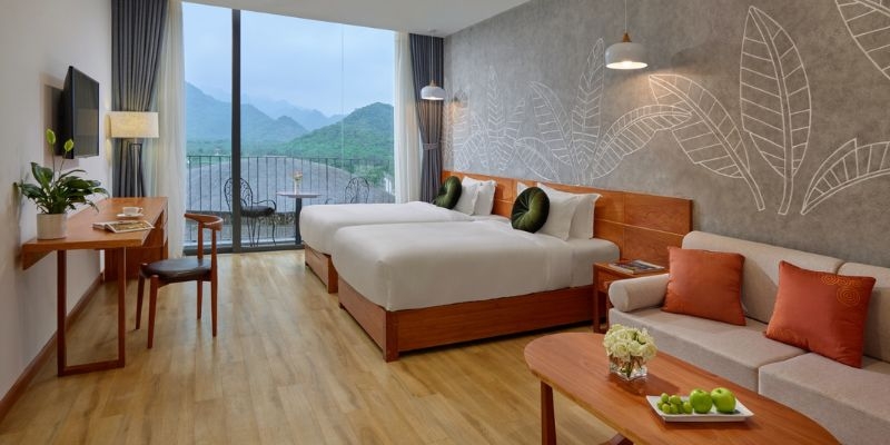 Điều đặc biệt nhất trong phòng Family Junior Suite chính là ban công rộng thoáng, hướng thung lũng, núi và hồ, mang đến một không gian lý tưởng để bạn thưởng thức toàn cảnh thiên nhiên kỳ vĩ của Ninh Bình. Từ đây, bạn có thể dễ dàng chiêm ngưỡng vẻ đẹp hùng vĩ của núi rừng, dõi theo cảnh hoàng hôn buông xuống hay ngắm nhìn khu rừng đặc dụng phía xa, tạo nên một bức tranh thiên nhiên sống động và đầy mê hoặc.